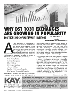 Kay Properties and Investments, LLC is a national Delaware Statutory Trust (DST) investment firm with offices in Los Angeles, San Diego, San Francisco, Seattle, New York City and Washington DC. Kay Properties team members collectively have over 94 years of real estate experience, are licensed in all 50 states, and have participated in over $7 billion of DST real estate. Our clients have the ability to participate in private, exclusively available DST properties as well as those presented to the wider DST marketplace; with the exception of those that fail our due-diligence process. To learn more about Kay Properties please visit: www.kpi1031.com Call: 1-855-899-4597 or email: info@Kpi1031.com