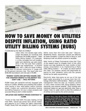 ivable often hits double-digit utility 550% more than this time last year.” (Source: usage decreases for buildings that Multifamily News) Apartment owners are affected implement the RUBS program - Ratio by these increases. It might be hard to hang on, and Utility Billing System. For example, tempting to sell, as utilities continue to escalate.