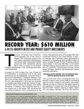 orrance, CA-based Kay Properties, country that generates some of the largest DST 1031 which operates one of the nation’s investment volume in the United States. In 2021, largest 1031 exchange property and for example, Kay Properties clients participated in real estate investment marketplaces, thousands of transactions, and the $610 million of announced today it had posted another equity invested through the Kay Properties platform record year after successfully placing was invested in more than $8 billion of real estate $610 million in equity for accredited offerings totaling approximately 50 million square