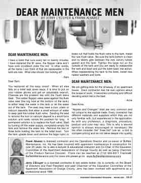 Frank Alvarez is licensed contractor and the Operations Director and co-owner of Buffalo Maintenance, Inc. He has been involved with apartment maintenance & construction for over 20 years. He is also a lecturer & educational instructor and Co-Chair of the Education Committee of the Apartment Association of Orange County as well as being Chairman of the roduct ervice Counsel. rank can be reached at (14) 56-1 rankie@ BuffaloMaintenance.com For more info please go to: www.BuffaloMaintenance.com