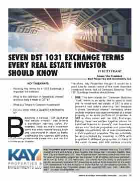 Kay Properties and Investments, LLC is a national Delaware Statutory Trust (DST) investment firm with offices in Los Angeles, San Diego, San Francisco, Seattle, New York City and Washington DC. Kay Properties team members collectively have over 94 years of real estate experience, are licensed in all 50 states, and have participat- ed in over $7 billion of DST real estate. Our clients have the ability to participate in private, exclusively available DST properties as well as those presented to the wider DST marketplace; with the exception of those that fail our due-diligence process. To learn more about Kay Properties please visit: www.kpi1031.com Call: 1-855-899- 4597 or email: info@Kpi1031.com